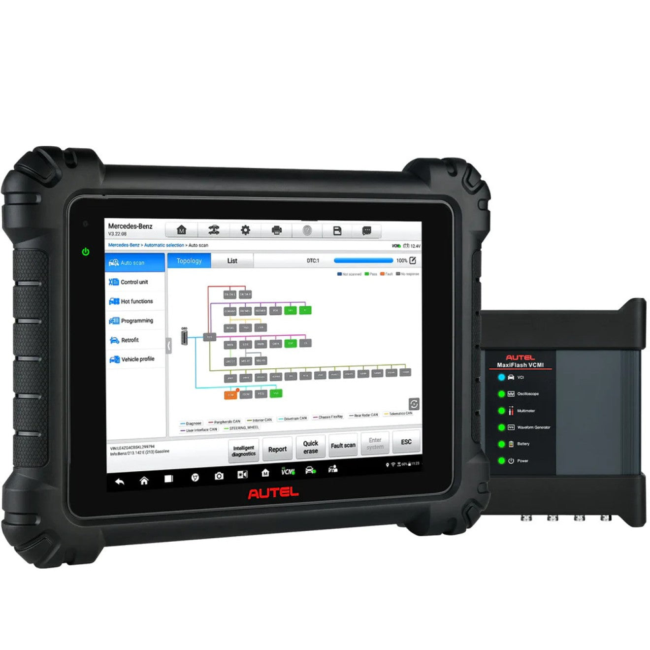 Das MaxiSYS MS919 ist ein fortschrittliches Diagnosetablet mit 9,7-Zoll-Touchscreen auf Android-Basis, das mit einem Octa-Core-Prozessor und 128 GB internem Speicher ausgestattet ist und über das MaxiFlash VCMI verfügt, ein 5-in-1-Kommunikations- und Testtool, das die drahtlose Fahrzeugkommunikation zwischen Fahrzeug und Tablet ermöglicht und die neuesten Fahrzeugkommunikationsprotokolle DoIP / CAN-FD, D-PDU und Mega-CAN unterstützt. Das VCMI fungiert auch als 4-Kanal-Oszilloskop, Wellenformgenerator, Multimeter und Can-BUS-Tester.